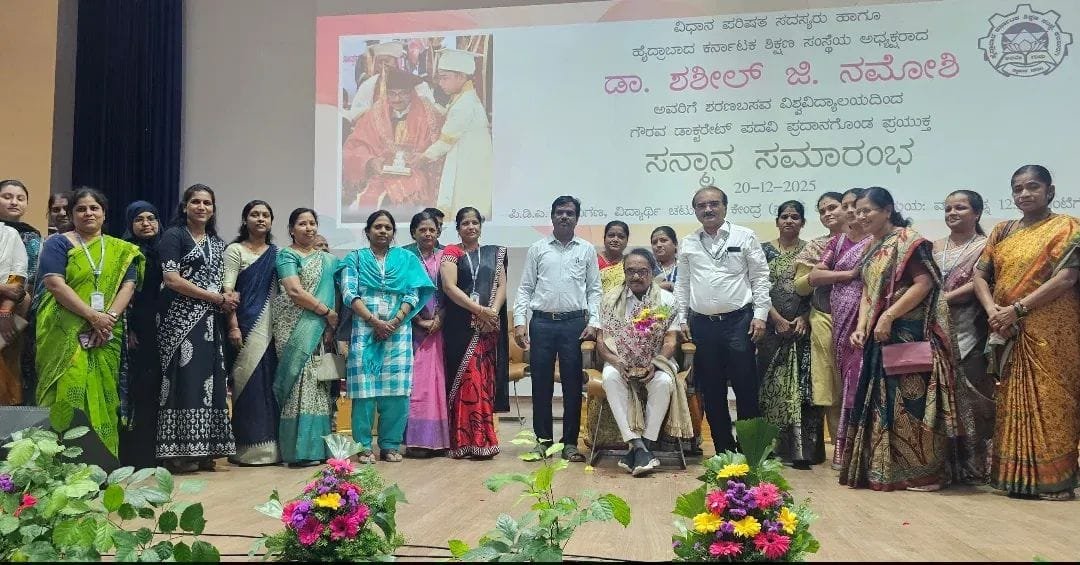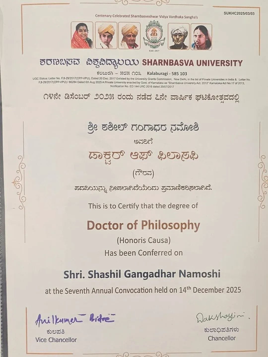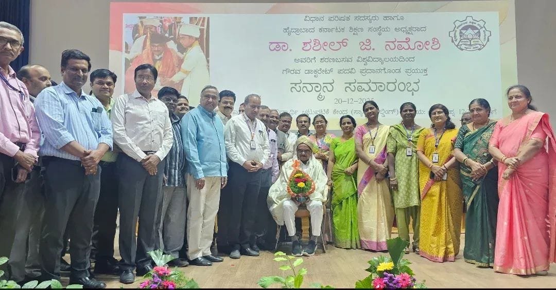 ಶ್ರೀ ಶಶಿಲ್ ಜಿ ನಮೋಶಿ, ಎಂ ಎಲ್ ಸಿ, ಮತ್ತು ಹೈದ್ರಾಬಾದ ಕರ್ನಾಟಕ ಶಿಕ್ಷಣ ಸಂಸ್ಥೆಯ ಅಧ್ಯಕ್ಷರು, ಇವರ ಶೈಕ್ಷಣಿಕ, ರಾಜಕೀಯ ಮತ್ತು ಸಾಮಾಜಿಕ ಕ್ಷೇತ್ರದಲ್ಲಿನ ಸೇವೆಯನ್ನು ಗುರುತಿಸಿ ಶರಣಬಸವ ವಿಶ್ವವಿದ್ಯಾಲಯದ ವತಿಯಿಂದ ಗೌರವ ಡಾಕ್ಟರೇಟ್ ನೀಡಿ ಗೌರವಿಸಿದರ ಪ್ರಯುಕ್ತ ಇಂದು, ದಿ. 20-12-2025, ಸಂಸ್ಥೆಯ ಪಿ.ಡಿ.ಎ. ಸಭಾಂಗಣದಲ್ಲಿ ಸಂಸ್ಥೆಯ ವತಿಯಿಂದ ಅಭಿನಂದನಾ ಸಮಾರಂಭವನ್ನು ಹಮ್ಮಿಕೊಳ್ಳಲಾಗಿತ್ತು.