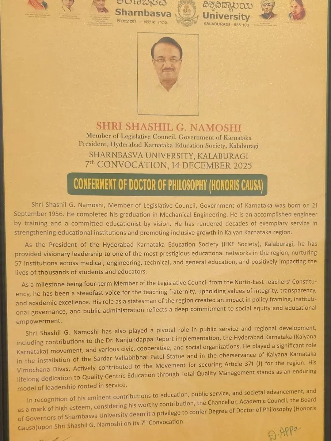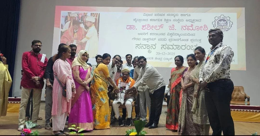 ಶ್ರೀ ಶಶಿಲ್ ಜಿ ನಮೋಶಿ, ಎಂ ಎಲ್ ಸಿ, ಮತ್ತು ಹೈದ್ರಾಬಾದ ಕರ್ನಾಟಕ ಶಿಕ್ಷಣ ಸಂಸ್ಥೆಯ ಅಧ್ಯಕ್ಷರು, ಇವರ ಶೈಕ್ಷಣಿಕ, ರಾಜಕೀಯ ಮತ್ತು ಸಾಮಾಜಿಕ ಕ್ಷೇತ್ರದಲ್ಲಿನ ಸೇವೆಯನ್ನು ಗುರುತಿಸಿ ಶರಣಬಸವ ವಿಶ್ವವಿದ್ಯಾಲಯದ ವತಿಯಿಂದ ಗೌರವ ಡಾಕ್ಟರೇಟ್ ನೀಡಿ ಗೌರವಿಸಿದರ ಪ್ರಯುಕ್ತ ಇಂದು, ದಿ. 20-12-2025, ಸಂಸ್ಥೆಯ ಪಿ.ಡಿ.ಎ. ಸಭಾಂಗಣದಲ್ಲಿ ಸಂಸ್ಥೆಯ ವತಿಯಿಂದ ಅಭಿನಂದನಾ ಸಮಾರಂಭವನ್ನು ಹಮ್ಮಿಕೊಳ್ಳಲಾಗಿತ್ತು.